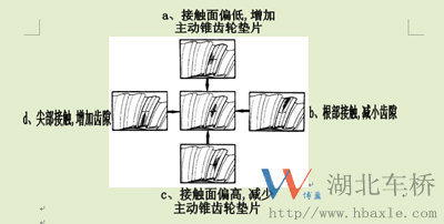錐齒輪必須有正確的嚙合印痕和嚙合間隙才能正常工作和達(dá)到正常的使用壽命。正確的嚙合印痕和間隙是通過齒輪軸向移動改變其相對位置來實現(xiàn)的。因而錐齒輪都有軸向位的調(diào)整裝置:(1)主動錐齒輪主要是通過增減軸承座與主減殼之間的調(diào)整墊片厚度來調(diào)整,調(diào)整墊片最多使用3片,以防不平引起漏油,薄片放在中間,如果嚙合印痕偏向齒根部將增加墊片厚度,偏向齒頂部將減少墊片厚度(如下圖);(2)從動錐齒輪的軸向調(diào)整裝置是與軸承預(yù)緊力的調(diào)整裝置是共用的。在預(yù)緊力調(diào)整好后只要將左右兩側(cè)的調(diào)整螺母(俗稱花螺母)從一側(cè)調(diào)整到另一側(cè),或者左右兩側(cè)的螺母一側(cè)松幾扣另一側(cè)等量緊幾扣,就可以在保證軸承預(yù)緊力不變的情況下到達(dá)嚙合間隙狀況調(diào)整的目的,一般這個間隙控制在0.2-0.4之間為宜。如果嚙合印痕偏齒廓的小端則增加齒隙,反之則減小齒隙(如下圖)